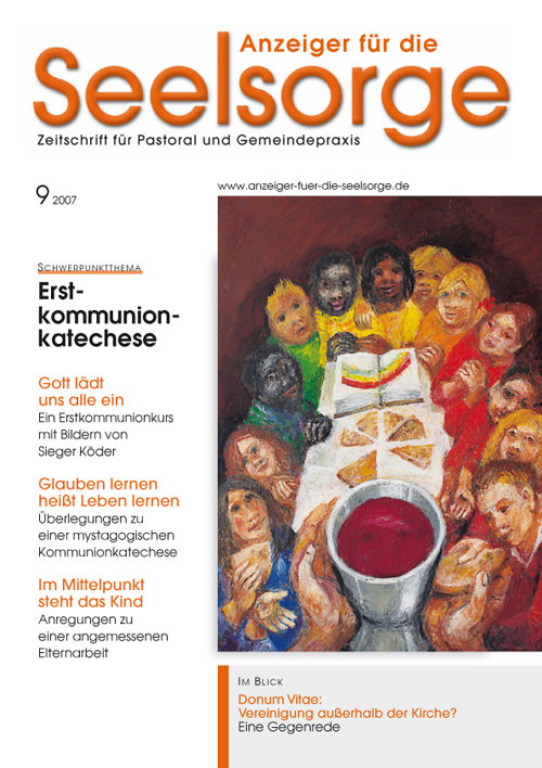 Es ist ein Glücksfall, wenn ein Maler-Poet wie der Ellwangener Pfarrer Sieger Köder dafür gewonnen werden kann, Bilder für eine Erstkommunionvorbereitung zu gestalten. Sechs von ihm entworfene Motive stehen im Zentrum der Erst- kommunionkatechese „Gott lädt uns alle ein", die gerade im Verlag Herder erschienen ist. Konsequent stellt dieser Kommunionkurs das Brot als das zentrale Symbol des Abendmahls in den Mittelpunkt und führt die Kinder von diesem zentralen Symbol aus in den christlichen Glauben ein. Im Schwerpunktthema dieses Monats stellen die Autoren den Erstkommunion- kurs mit seinen sechs inhaltlichen Kapiteln, seiner didaktischen Gliederung sowie seiner methodischen Aufbereitung vor. Sie zeigen auf, wie es gelingen kann, den Glauben aus dem zentralen Geheimnis der Eucharistie heraus zu entdecken. Und Kinder dabei zu befähigen, ihre eigene Meditations- und Gebetspraxis zu entwickeln.