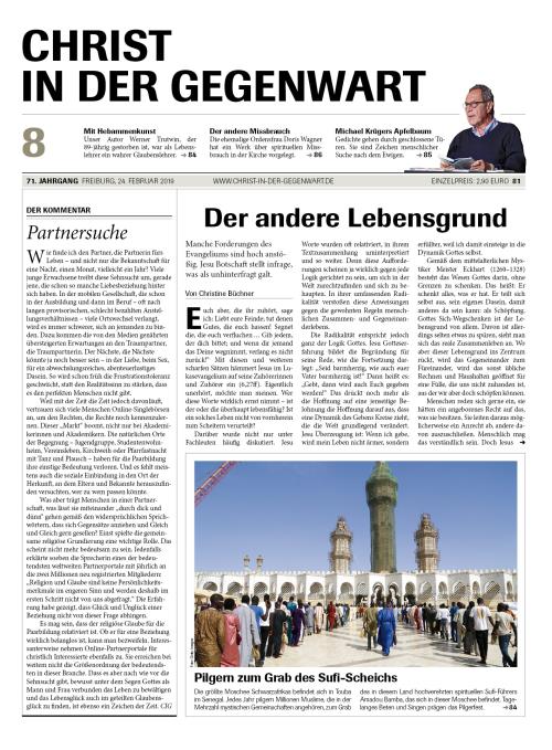 Letztlich werden durch das Buch all denen die Augen geöffnet, die sich in Abhängigkeiten befinden. Ihnen wird Mut gemacht, auszubrechen, einen Neuanfang zu wagen. Und denjenigen, die schon lange an manchem Unbehagen an der Kirche und in der Kirche leiden, bietet das an keiner Stelle polemische Buch Gelegenheit, Gewissheiten zu überdenken, Sensibilität für Abhängigkeiten im eigenen Umfeld zu entwickeln und dort Veränderungen anzustoßen. Dass Doris Wagner trotz ihrer schlimmen Erfahrungen ihre scharfsinnige Analyse mit großer Sehnsucht nach dem Gottesglauben und nach der Kirche schreibt, ist dafür ein wunderbarer Türöffner.