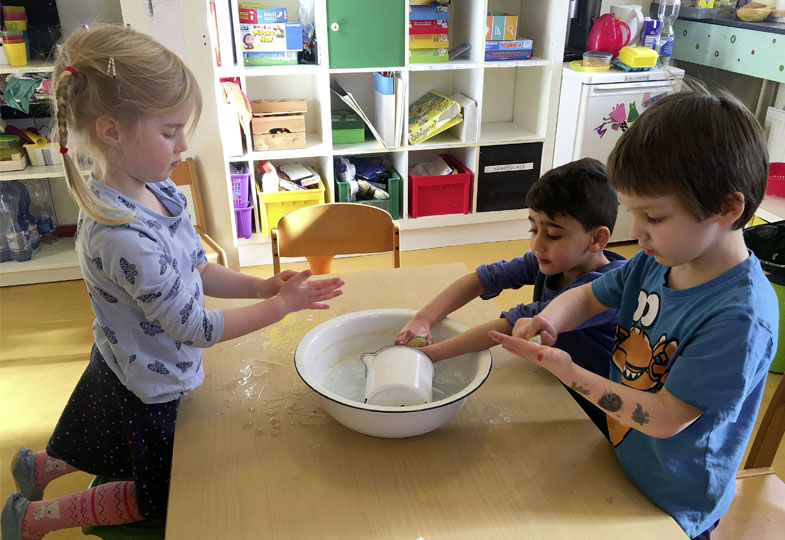 Unser Vorschlag, eine Zeit lang ohne fließendes Wasser aus dem Wasserhahn auszukommen und sich die Hände stattdessen mit Schüssel und Krug zu waschen, gefiel sowohl Luca als auch den anderen Kindern. In den nächsten Tagen wuschen sich die Kinder immer mind. zu zweit die Hände: Ein Kind spielte mit einem Krug den Wasserhahn, während sich ein anderes darunter die Hände wusch. Da uns das Thema „Hände waschen“ noch eine Weile begleitete, richteten wir eine Seifenwerkstatt ein, in der sich die Kinder individuelle Seifenstücke anfertigten und stets mit zum Hände waschen nahmen.