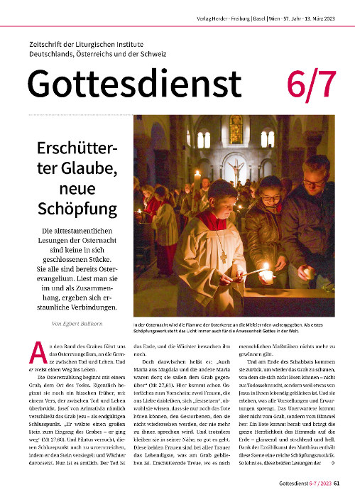 Plus S. 61-64 Erschütterter Glaube, neue Schöpfung Die alttestamentlichen Lesungen der Osternacht sind keine in sich geschlossenen Stücke. Sie alle sind bereits Osterevangelium. Liest man sie im und als Zusammenhang, ergeben sich erstaunliche Verbindungen. Von Egbert Ballhorn