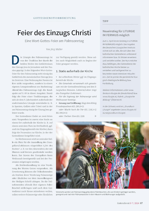 Plus S. 67 Gottesdienstvorbereitung Feier des Einzugs Christi: Eine Wort-Gottes-Feier am Palmsonntag Von Jörg Müller