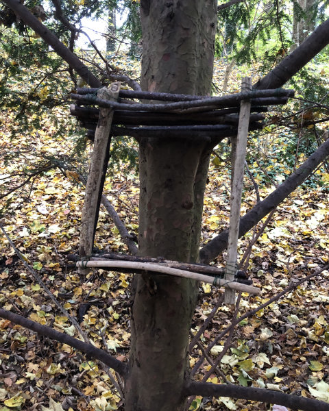 Das Interesse der Kinder an Vögeln und Materialien in der Natur brachte uns auf die Idee, ein Futterhaus aus Ästen zu bauen. Zusammen überlegten wir, wie viele Stöcke dafür gebraucht werden und wie groß diese sein müssen, damit zum Beispiel eine Amsel ins Haus hineinpasst. Die Kinder fertigten am Werktisch draußen eine Skizze an, um sich die Größenverhältnisse besser vorstellen zu können. Sie kamen auf sieben Stöcke für den Boden und acht für das Dach. Außerdem benötigten sie vier dicke Äste, um beide Bauteile miteinander zu verbinden. Mit der Zeichnung im Gepäck ging es im Wald auf die Suche nach daumendicken Bruchstücken in einer Länge von 20 bis 30 Zentimetern. Nach einer Trockenzeit von etwa 14 Tagen konnten die Kinder endlich loslegen. Einige Äste mussten sie mit kleinen Sägen kürzen. Immer wieder zählten sie nach, ob ausreichend Material für den Boden, das Dach und die Säulen vorhanden war. Zwei Kinder bauten den Boden, indem sie ein Stockende ein paar Mal mit Draht umwickelten und auf diese Weise einen Ast nach dem anderen hinzufügten. Eine zweite Gruppe baute das Flachdach nach dem gleichen Prinzip. Verbunden wurden die beiden Teile mit einem dicken Ast in jeder Ecke. Für das fertige Futterhaus suchten wir einen windgeschützten Platz in einem Baum und streuten Nüsse und Körner aus. Seither besuchen wir die Futterstelle regelmäßig und füllen sie nach. Die Kinder vermuten, dass sich auch Eichhörnchen an den Nüssen bedienen.