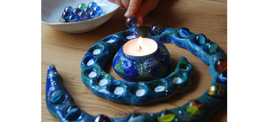 Adventsspirale aus Ton für Kinder Kleines Ritual für die Vorweihnachtszeit. Jeden Abend zünden die Geschwister Frida und Helge die Kerze in der Mitte der Spirale an und legen eine weitere Murmel hinzu. Ein schöner Moment, um anschließend einer Geschichte zu lauschen oder einander vom Tag zu erzählen Miriam Staab Die Vorweihnachtszeit schön gestalten © Miriam Staab Teilen Teilen Whatsapp Mailen 30.6.2019 Material Soft-Ton oder andere lufttrocknende Modelliermasse Messer runder Deckel Teelicht Schale mit Wasser 24 Murmeln oder Muggelsteine Backblech, Backpapier Wasserfarben, Pinsel, Wasserbecher Klarlack Glitzer So geht's Zuerst zwei Blöcke von der Modelliermasse abtrennen, einen größeren für die Spirale, einen kleineren für den Kerzenhalter. Nun gilt es, die Masse geschmeidig zu machen. Dafür wird sie mehrmals auf die Arbeitsfläche geschlagen und gut durchgeknetet. Das größere Tonstück zu einer langen, dicken Schlange rollen und diese zu einer Spirale legen. Für den Kerzenhalter den Ton zu einer Kugel formen und mithilfe des Deckels fest auf die Arbeitsfläche pressen. Das Teelicht in die so entstandene Mulde drücken und den Rand anpassen. Achtung, ausreichend Platz lassen – der Ton zieht sich beim Trocknen etwas zusammen. Die gestalteten Objekte auf ein mit Backpapier versehenes Backblech setzen. Als Nächstes die Finger mit Wasser befeuchten und die Oberflächen schön glatt streichen. Die Murmeln in die Spirale drücken und wieder entfernen, sodass 24 Mulden entstehen. Auch hier für genügend Spielraum sorgen, damit nach dem Trocknen noch alles passt. Die Modelliermasse nach Herstellerangaben trocknen lassen. Die Spirale und den Teelichthalter nach Belieben mit Wasserfarben bemalen. Wer möchte, überzieht die Objekte abschließend mit einer Lackschicht und streut sofort etwas Glitzer darüber.