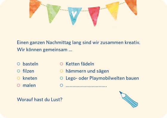 Die Box enthält 25 gestaltete Gutscheine mit Ideen sowie eine Glückwunschkarte, die für einen persönlichen Gruß genutzt werden kann.