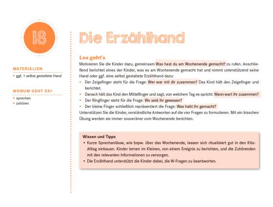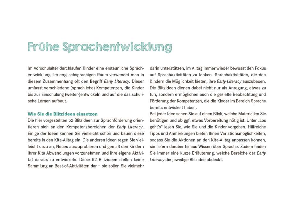 52 Ideen für ein ganzes Jahr im kompakten Kalenderformat – rund um das Thema „Sprache“. Großformatige Fotos und kurze Anleitungen sorgen für einen einfachen Einsatz im Kita-Alltag: Die Ideen erfordern keine langen Vorbereitungszeiten, sind schnell zu erfassen und umzusetzen. Die vorgestellten Impulse unterstützen Kita-Kinder ab 3 Jahren in ihrer Sprachentwicklung und ermuntern sie zu einem spielerischen Umgang mit Sprache. Hier reimen die Kinder, erzählen Geschichten, sammeln Wörter, klatschen Silben, spielen Theater und machen Mundgymnastik.