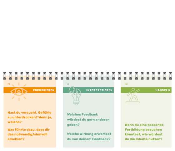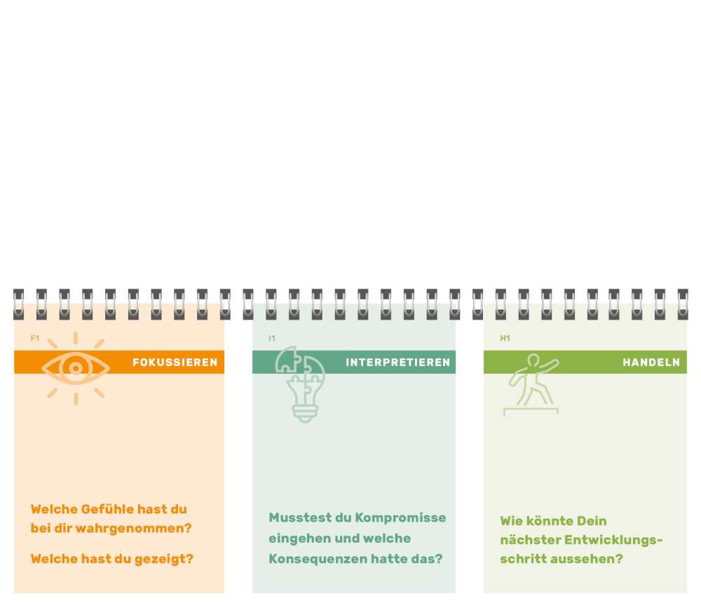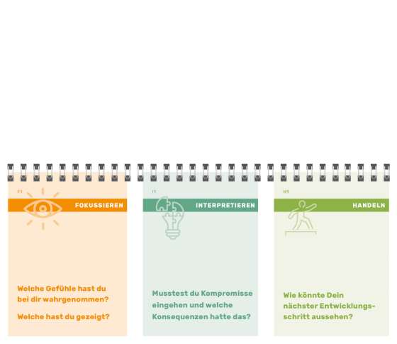 Das Reflexionstool ist ein unverzichtbares Werkzeug, mit dem Fachkräfte gezielt in den dreistufigen Reflexionsprozess starten können. Die Funktionsweise ist denkbar einfach. Rufe dir eine Situation ins Gedächtnis, aus der du Rückschlüsse ziehen möchtest. Wähle aus jedem der drei Fragenstapel eine Seite aus. Finde möglichst detaillierte und differenzierte Antworten auf jede der 3 Fragen. Und los geht's: