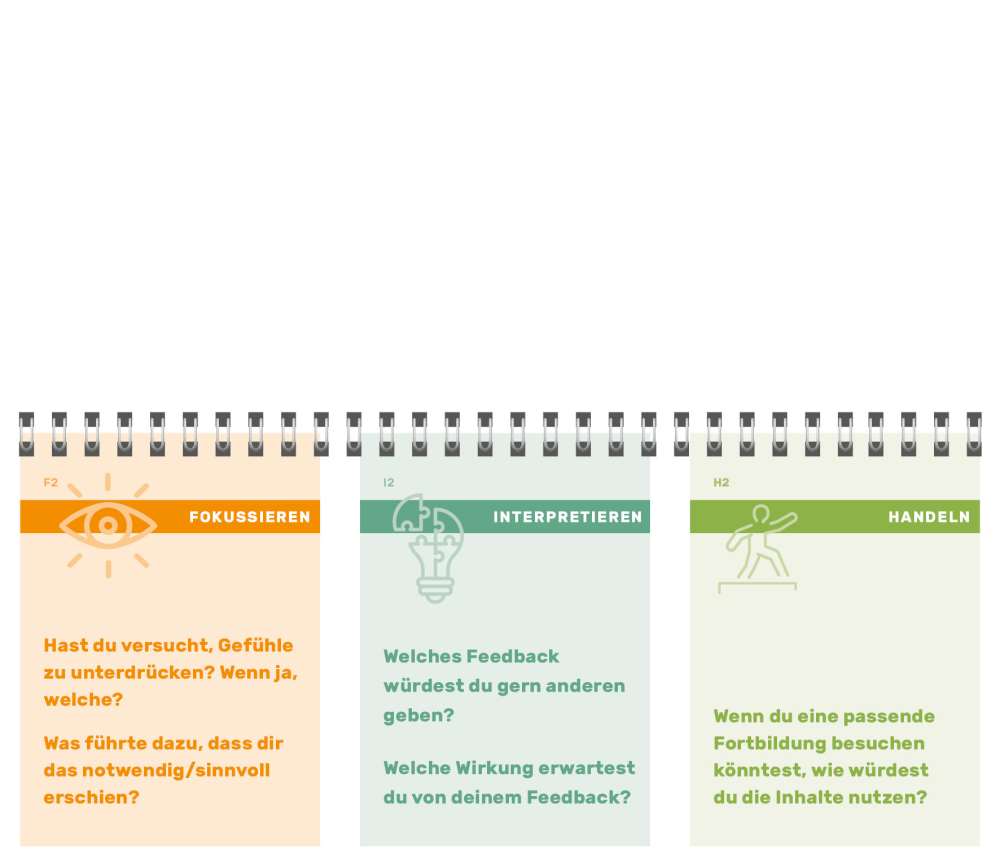 Phase 1, fokussieren, bedeutet festzulegen, unter welchem Aspekt die Situation/Erfahrung betrachtet wird (etwa Gefühle, Beziehungen, Vorgehensweisen ...) Dazu zählen alle Seiten des linken Fragenstapels.