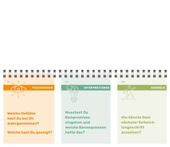 Phase 3, handeln, bedeutet, zukünftige Handlungsoptionen aus den Erkenntnissen der Phasen 1 und 2 abzuleiten. Dazu gehören die Seiten des rechten Fragenstapels.