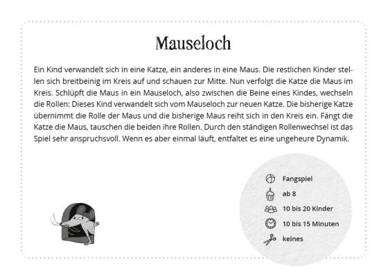 Mückenflug, Bäumchen wechsle dich, Bärenjagd ... Dieses Kartenset ist eine gekonnte Sammlung aus längst vergessenen sowie neuen Spieleklassikern. Sie bietet pädagogischen Fachkräften sowie Quereinsteiger:innen in Ganztag und Hort ein Standardrepertoire an Bewegungs-, Fang-, Such-, Wahrnehmungs- und Versteckspielen. Die Spiele eignen sich für kleine sowie große Gruppen, für längere sowie kürzere Spielphasen und besonders gut für das Spielen im Wald und auf der Wiese. Alle Spiele präsentieren sich einfach erfassbar und übersichtlich mit hilfreichen Angaben zu Alter, Dauer, Spielart und Materialien. Ohne großen Aufwand, einfach spiel- und integrierbar in jeden Tagesablauf!