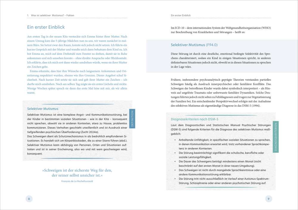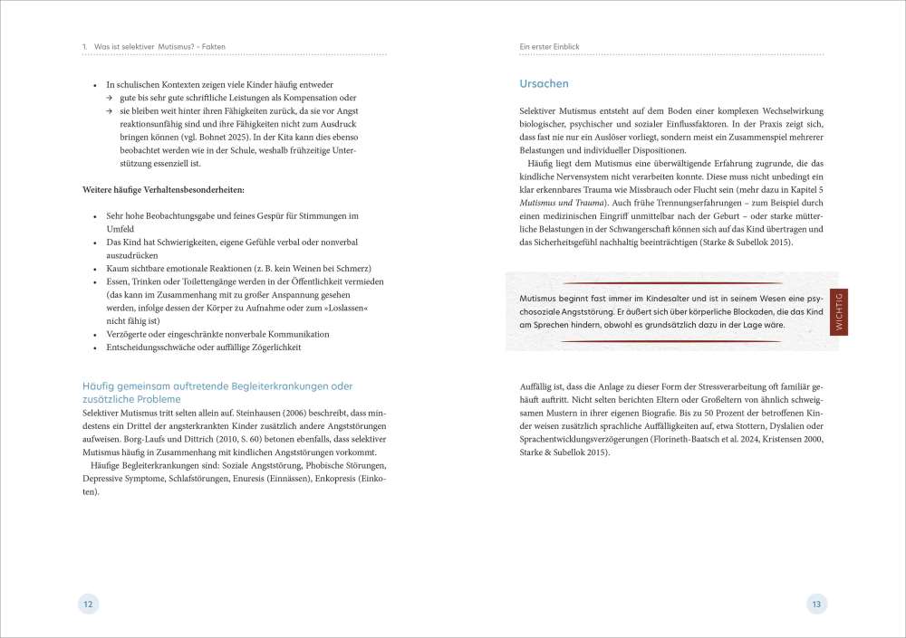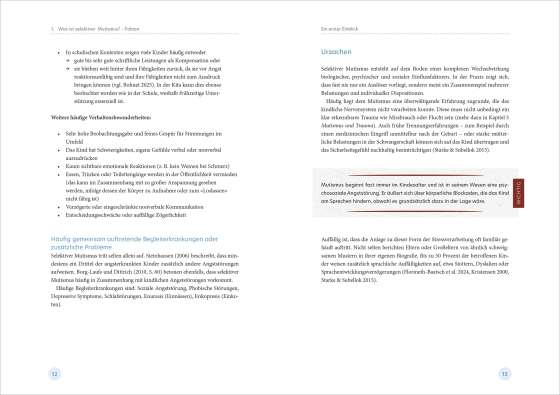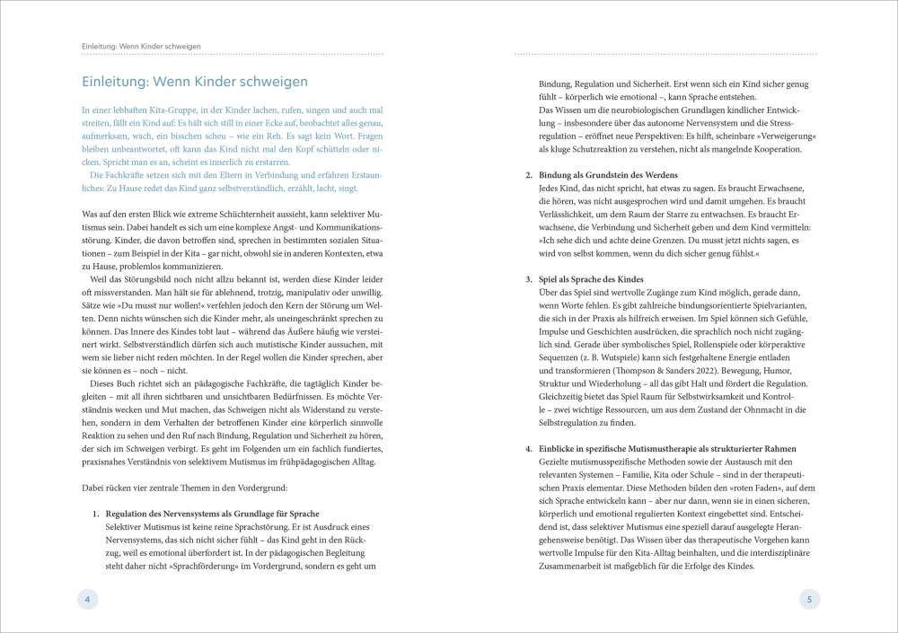 Kinder, die in der Kita schweigen, obwohl sie sprechen können, stellen pädagogische Fachkräfte vor besondere Herausforderungen. Betroffene Kinder tun dies nicht aus Trotz oder Schüchternheit, sondern weil ihr Nervensystem in den Rückzug geht. Pia Zucht zeigt in diesem Buch einen ganzheitlichen Blick auf selektiven Mutismus und verbindet Fachwissen für die Kita mit berührenden Einblicken in den Therapiealltag betroffener Kinder. Mit vielen praxisnahen Tipps sowie fundiertem Hintergrundwissen für pädagogische Fachkräfte gelingt ein Perspektivwechsel, der Sicherheit schafft – für die Kinder und für das pädagogische Handeln im Kita-Alltag.