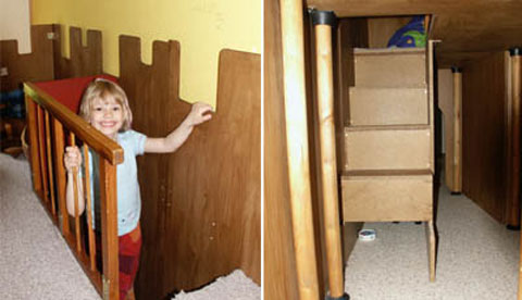 Zugegeben - die bespielbare Burg kostet in der Fertigung einige Mühe und auch Geld. Doch einmal aufgebaut haben Ihre Kinder jahrelang ein Spielmöbel im Kinderzimmer, das einmalig ist. Je nach Abmessung dient die Burg auch als vorübergehender Schlafplatz oder Gästebett für Freunde. Damit der untere Bereich der Burg auch bespielbar ist, sollte die Zwischendecke mit einer Mindesthöhe von einem Meter angebracht werden. Kleine Kinder können dann aufrecht, größere immerhin in der Hocke darin spielen.
