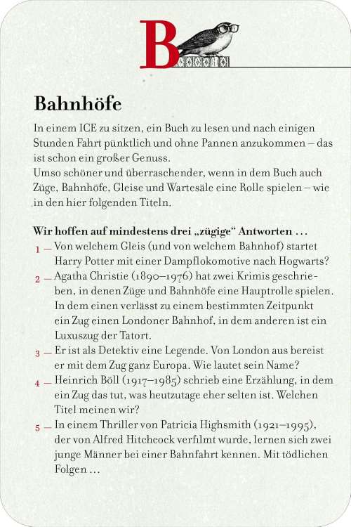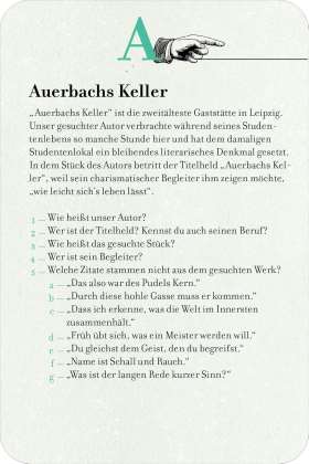 Wer Faust für einen Körperteil und die Blechtrommel für ein Spielzeug hält, ist hier eindeutig falsch. Sie lesen gerne und viel und wissen natürlich ganz genau, dass hier die Rede von Goethe und Grass ist? Dann ist das große Literatur-Quiz genau das Richtige für Sie! Mit diesem unterhaltsamen Quiz begeben Sie sich auf eine literarische Reise von A bis Z in 120 Etappen: von der Antike bis in die Zukunft, von Andorra bis Zamonien, vom berühmten Bestseller bis zur berüchtigten Biografie.