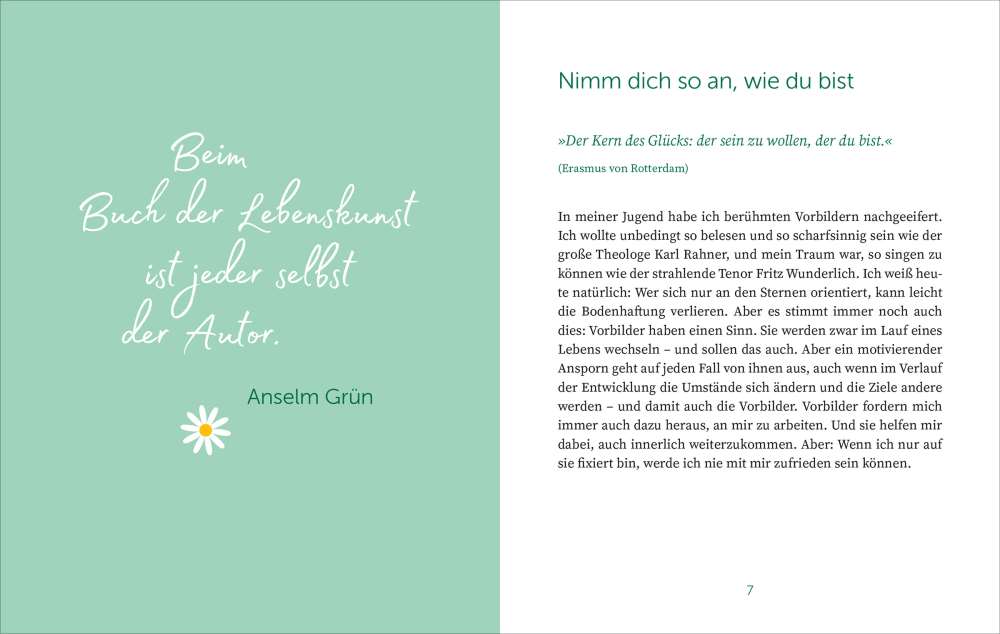 Ein Buch wie ein kleiner Glücksbringer: Im handlichen Format gibt es seinen Leserinnen und Lesern die Möglichkeit, den großen Gedanken Anselm Grüns und seiner Lebensphilosophie nachzuspüren. Der praktische Alltagsbegleiter widmet sich intensiv der Königsdisziplin Lebenskunst. Hübsch gestaltete Texte und ansprechende Mitmachteile mit spannenden Fragen, motivierenden Übungen und kreativen Eintragmöglichkeiten machen Lust darauf, sich selbst besser kennenzulernen – getreu dem Motto Anselm Grüns: "Nur wer barmherzig ist mit sich selbst, kann auch zu anderen gut sein".