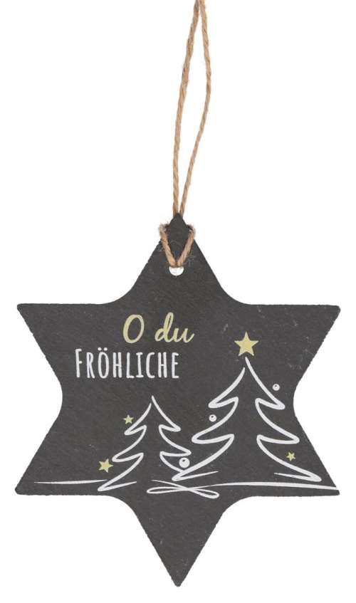 Als Teil der alljährlichen besinnlichen Weihnachtsfest-Dekoration ist der Schieferanhänger "O du Fröhliche" eine großartige Wahl. Der schmückende Anhänger in Sternform kann an Wand, Tür oder Fenster angebracht werden und verleiht jedem Raum eine winterliche Atmosphäre. Er ist farbig bedruckt mit weißen Tannen und goldfarbenen Sternen und trägt den inspirierenden Schriftzug "O du Fröhliche". Dieser Anhänger ist nicht nur eine schöne Dekoration für das eigene Zuhause, sondern eignet sich auch als besinnliches Geschenk zum Fest.