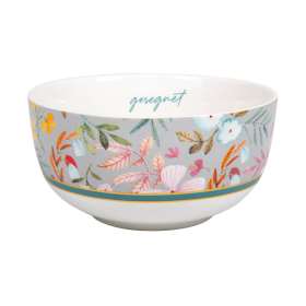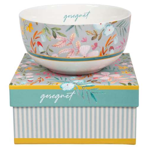 Mit dieser besonderen Müslischale aus Porzellan starten wir munter in den Tag. Der Schriftzug "gesegnet" gibt uns eine so einfache wie klare biblische Botschaft mit. Die floral gestaltete Schale eignet sich auch für Obst und Süßigkeiten. Verpackt in passender Geschenkbox, die sich prima zum Sammeln von Kleinigkeiten wie Knöpfen, Stiften u. Ä. eignet.