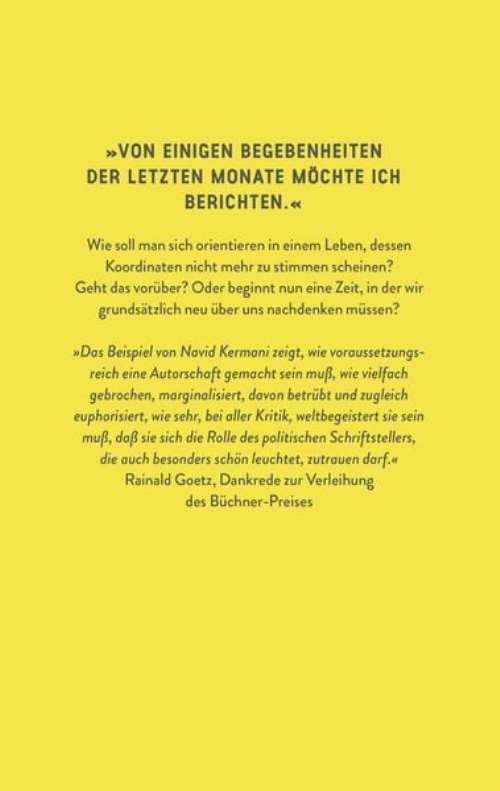 Wie ist es, wenn sich die vertraute Welt auflöst, wenn das, was gestern noch normal war, heute nicht mehr gilt? Navid Kermani fängt diesen Moment in einem einzigen Sommer ein: Ein Freund, der zuletzt politisch auf Abwege geraten war, hat sich das Leben genommen. Die Kriege rücken näher und die Debatten werden schriller. Seine Freundin hält den Erzähler für einen Macho, aber das bleibt bei weitem nicht der schlimmste Vorwurf, der sein Selbstbild erschüttert. Auf unnachahmliche Weise gelingt es Navid Kermani, unsere Gegenwart aus ihren Widersprüchen heraus zu begreifen, das scheinbar Unversöhnliche zu versöhnen und, wichtiger noch, das wirklich Unversöhnliche auszuhalten. Ein existenzieller, hellsichtiger Roman unserer Zeit.