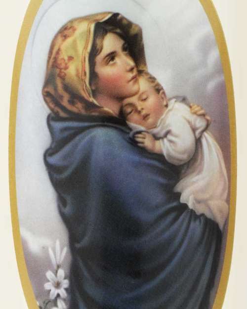 Diese schöne Kerze zeigt eine Maria mit Kind behütend auf dem Arm in goldener Umrahmung. Geeignet zur persönlichen Andacht oder als glaubensstarke Dekoration. Die hochwertige Tischkerze wurde in deutschen Werkstätten in Handarbeit angefertigt. Das RAL Gütesiegel gewährleistet den rußarmen und tropffreien Abbrand der Kerzen.