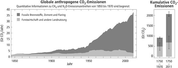 Abb. 1: Jährliche globale anthropogene Kohlendioxid (CO2)-Emissionen (Gigatonnen CO2 pro Jahr, Gt CO2/Jahr) aus der Nutzung fossiler Brennstoffe, Zementproduktion und Abfackeln (flaring) sowie Forstwirtschaft und anderer Landnutzung (FOLU), 1850–2011. Kumulative Emissionen von CO2 aus diesen Quellen und deren Unsicherheiten sind als Balken bzw. Antenne auf der rechten Seite dargestellt. {modifiziert aus WGI Abbildung TS. 4 und WGIII Abbildung TS. Quelle: IPCC 2014: 45}