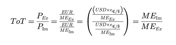 Die Prebish-Singer-These, d. h. die These der säkularen Verschlechterung der Terms of Trade des Südens, ist dabei eine häufig wiederkehrende Kritik am Weltwirtschaftssystem. Die ToT, also das reale Güteraustauschverhältnis, ist definiert als das Verhältnis des Exportgüterpreisniveaus zum Importgüterpreisniveau, dieses entspr. wiederum dem Verhältnis von Import- zu Exportmengeneinheiten. In der folgenden Formel stellen der Euro (EUR) die Inlandswährung und der US-Dollar (USD) die Auslandswährung dar: