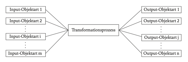 P.en werden als Prozesse abgebildet, bei denen Inputs (bestehend aus Input-Objektarten) in einem Transformationsprozess, der in Arbeitssystemen durchgeführt wird, in Outputs (Output-Objektarten) verwandelt werden (vgl. Abb. 1).