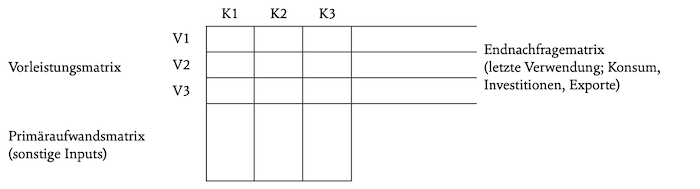 Diese Struktur stellt die Basis der sogenannten Input-Output-Tabelle dar. Sie besteht aus drei Teilen, der Vorleistungsmatrix, die letztlich die inländischen Vorleistungsverflechtungen darstellt, der Endnachfragematrix, die auf die inländischen und ausländischen Verwendungen hinweist, und der Primäraufwandsmatrix, die insb. auf die inländischen Produktionsfaktoren, die Gütersteuern abzüglich der Gütersubventionen sowie die Importe hinweist.