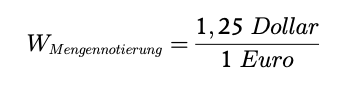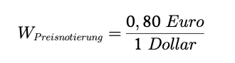 definiert. Man kann dies umgekehrt ausdrücken und den Preis eines Euros in Dollar-Einheiten messen; das ist die (in vielen Medien und in diesem Beitrag im Weiteren verwendete) sogenannte Mengennotierung.