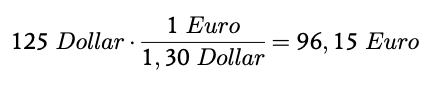 Ein Produkt, in Europa für 100 Euro hergestellt und in den USA bisher zum Preis von 125 Dollar verkauft, würde nach der Euro-Aufwertung mit 130 Dollar angeboten. Damit geht der Absatz in den USA preisbedingt zurück. Halten die Exportproduzenten am alten Auslandspreis fest, realisieren sie nicht länger 100 Euro, sondern nur