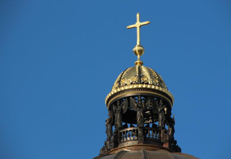 Das goldene Kreuz auf der Schlosskuppel in Berlin wurde am Tag nach seiner Anbringung (Der Tagesspiegel vom 29. Mai 2020) mit dem Text abgebildet: „Grüß Gott! Das Kreuz für die Kuppel ist umstritten. ... Ein Geistlicher war nicht vor Ort. Es handle sich schließlich nicht um ein Kreuz auf einer Kirche, sondern auf einem Kulturort.“ Die Kapelle unter der Kuppel wurde tatsächlich nicht rekonstruiert. Aber einen Tempel wird es dennoch geben. In Zukunft findet sich dort – Ironie der Geschichte – direkt unter Kuppel, Kreuz und Spruch ein Taubentempel, genauer gesagt, die buddhistische „Höhle der Ringtragenden Tauben“ aus dem Asiatischen Museum in Dahlem. Wären diese Tauben in Dahlem nicht besser aufgehoben?